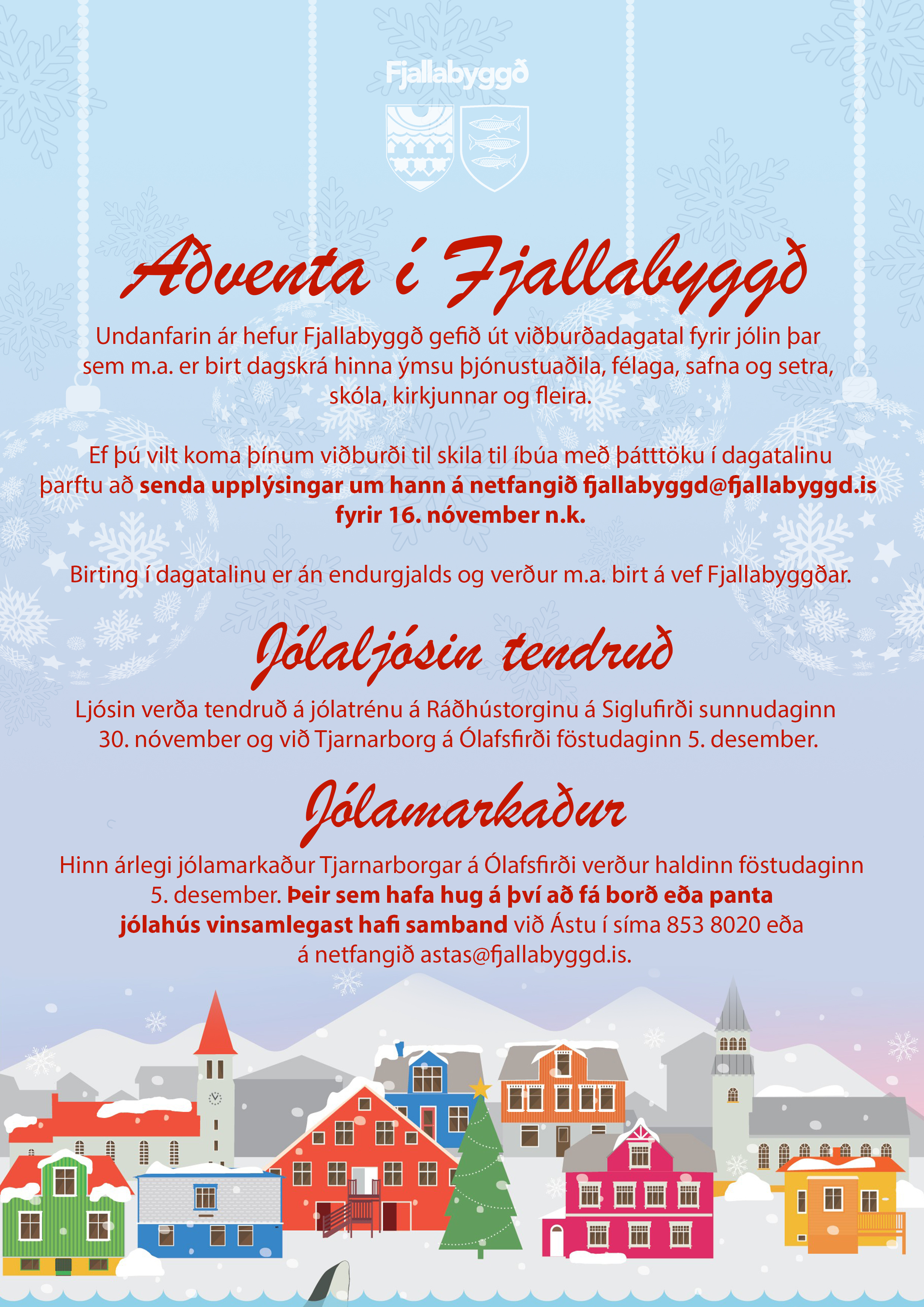 Undanfarin ár hefur Fjallabyggð gefið út viðburðadagatal fyrir jólin þar sem m.a. er birt dagskrá hinna ýmsu þjónustuaðila, félaga, safna og setra, skóla, kirkjunnar og fleira. Ef þú vilt koma þínum viðburði til skila til íbúa með þátttöku í dagatalinu þarftu að senda upplýsingar um hann á netfangið fjallabyggd@fjallabyggd.is fyrir 16. nóvember næstkomandi.