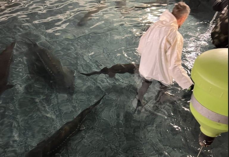 Mikið var um að vera í húsnæði Norðlenzka Styrjufjelagsins efh í Ólafsfirði þegar að bæjarstjóri Fjallabyggðar Sigríður Ingvarsdóttir og Bragi Kristjbjörnsson deildarstjóri stjórnsýslu og fjármála voru þar á ferðinni. Eyþór Eyjólfsson framkvæmdastjóri félagsins segir að nú á næstunni verði farið í að strjúka hrogn og svil úr hluta af fiskinum með sérstakri aðferð.