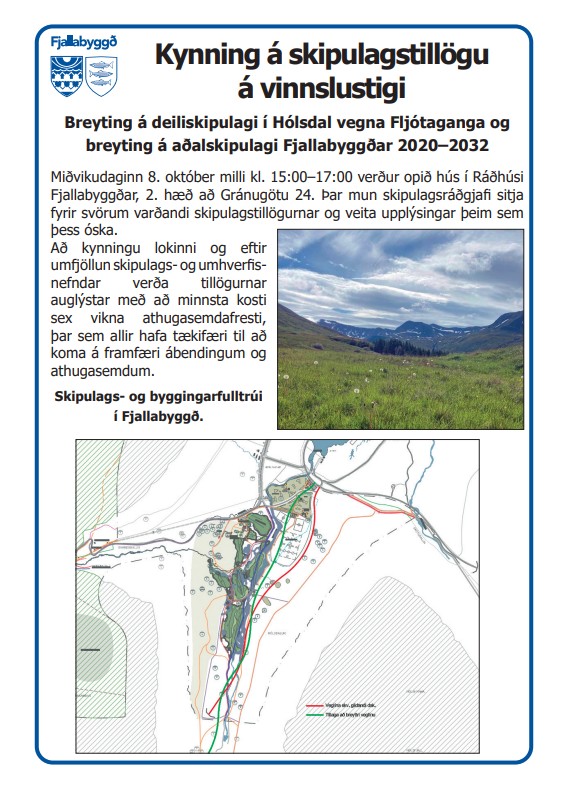 Miðvikudaginn 8. október milli kl. 15:00–17:00 verður opið hús í Ráðhúsi Fjallabyggðar, 2. hæð að Gránugötu 24. Þar mun skipulagsráðgjafi sitja fyrir svörum varðandi skipulagstillögurnar og veita upplýsingar þeim sem þess óska.