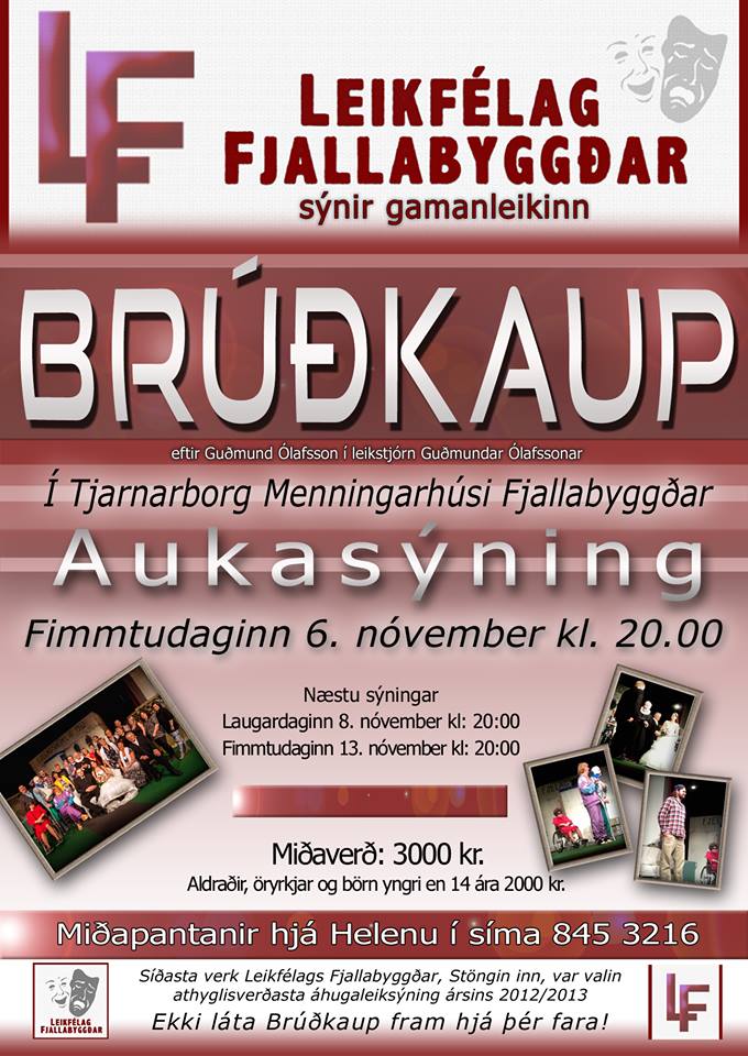 Þar sem viðtökur á gamanleiknum "Brúðkaup" hafa verið framar vonum, hefur Leikfélag Fjallabyggðar ákveðið að skella á aukasýningu á morgun, fimmtudaginn 6. nóvember.  Leikverkið er samið af Guðmundi Ólafssyni og er hann jafnframt leikstjóri.