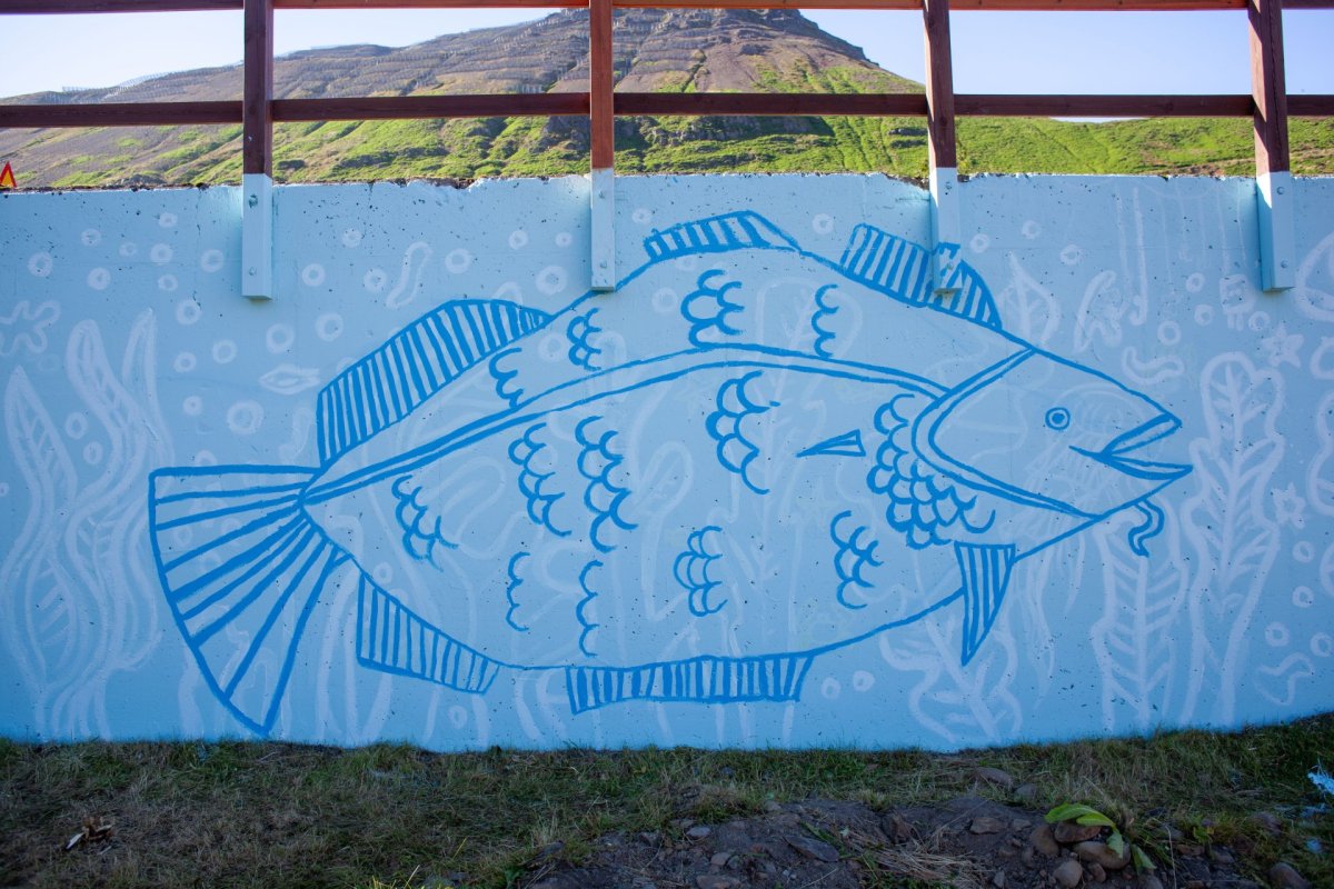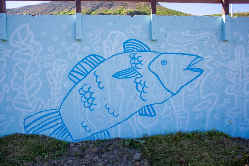 Veggurinn hafði verið málaður ljósblár af Fjallabyggð og tengdu börnin hann strax við lit sundlauganna í bænum. Úr hugmyndavinnunni spratt ákvörðunin um að mála djúpsjávarmynd með fiskum, kórölum, þangi og fleiri sjávarfurðum. Börnin teiknuðu sínar eigin myndir sem urðu hluti af veggmyndinni og máluðu þær síðan undir leiðsögn Emmu. Þau bjuggu til mjúkar lagskiptingar til að skapa dýpt og birtu, og lauk verkinu með stórum, handteiknuðum fiskum sem standa skemmtilega út úr myndinni.