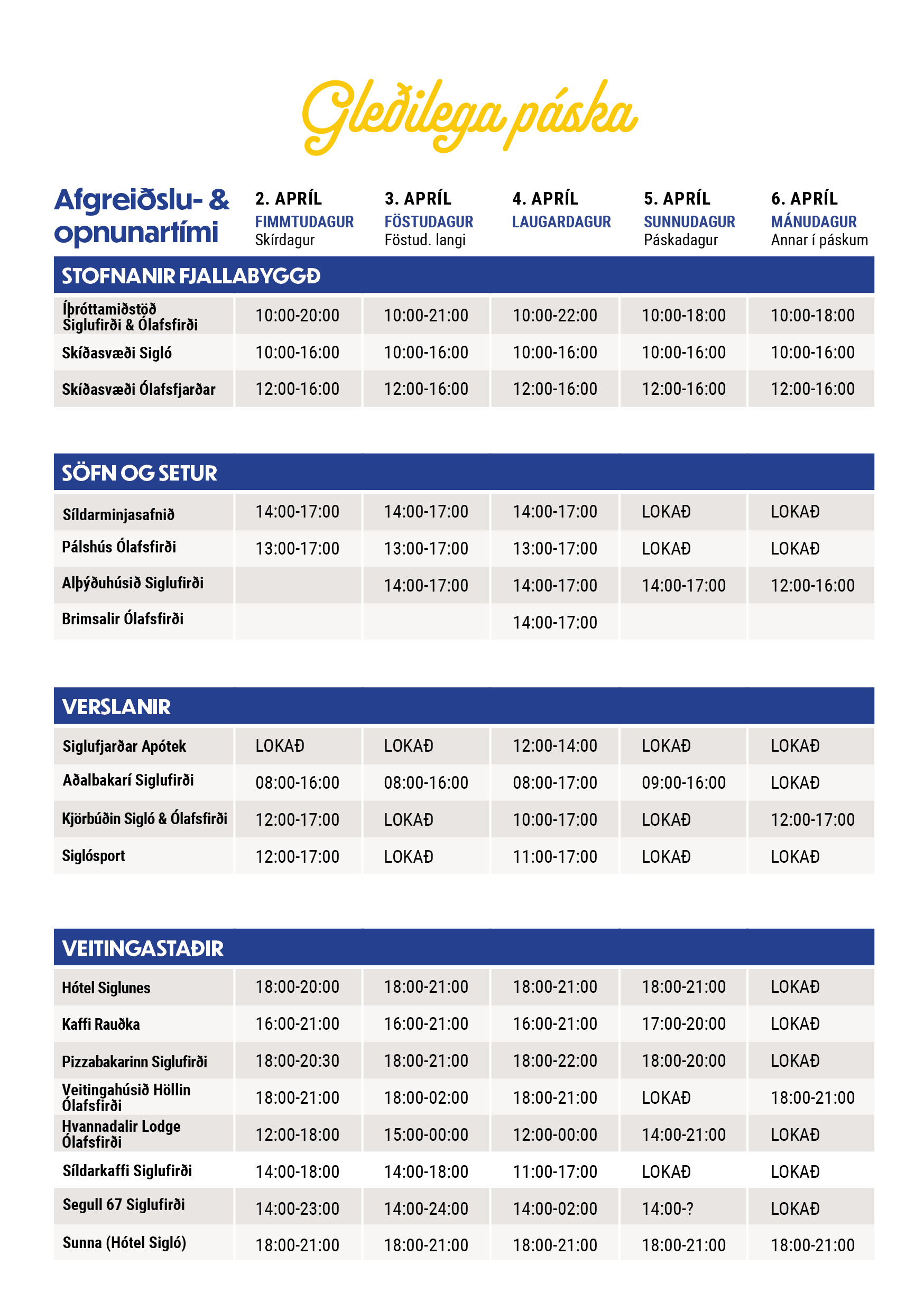 Við óskum öllum gleðilegra páska og hlökkum til að sjá ykkur njóta þess sem Fjallabyggð hefur upp á að bjóða.