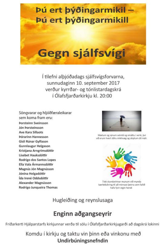 Í tilefni alþjóðadags sjálfsvígsforvarna, verður kyrrðar- og tónlistardagskrá í Ólafsfjarðarkirkju sunnudaginn 10. september nk. kl. 20:00.