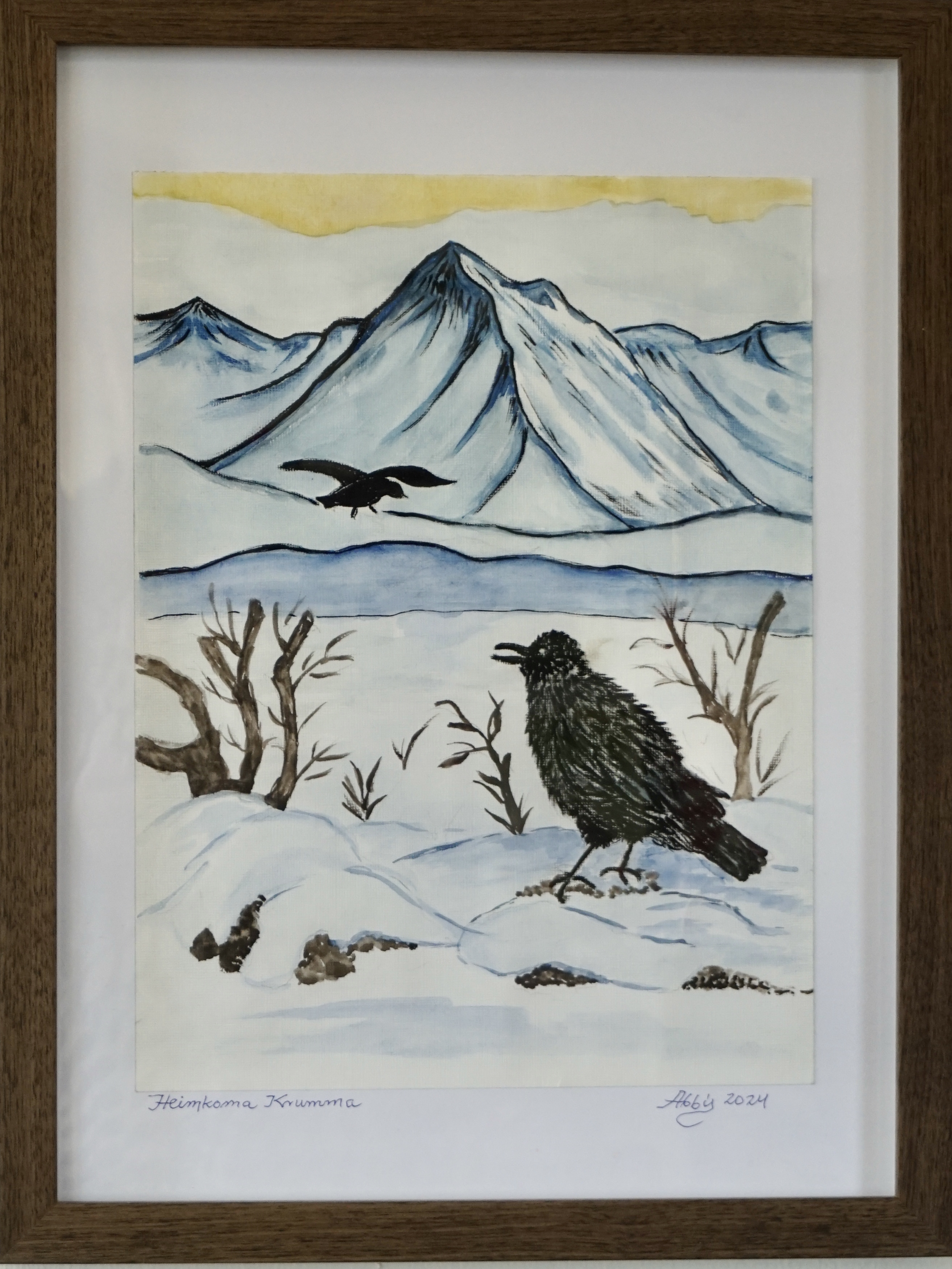 tússteikningar sem eru klettamyndanir í fjöllum fjarðarins og nefnast Tröllin í fjöllunum , og akrilmyndir sem bera yfirskriftina vetur, sumar, vor og haust og hafa Hólshyrnuna í bakgrunni og