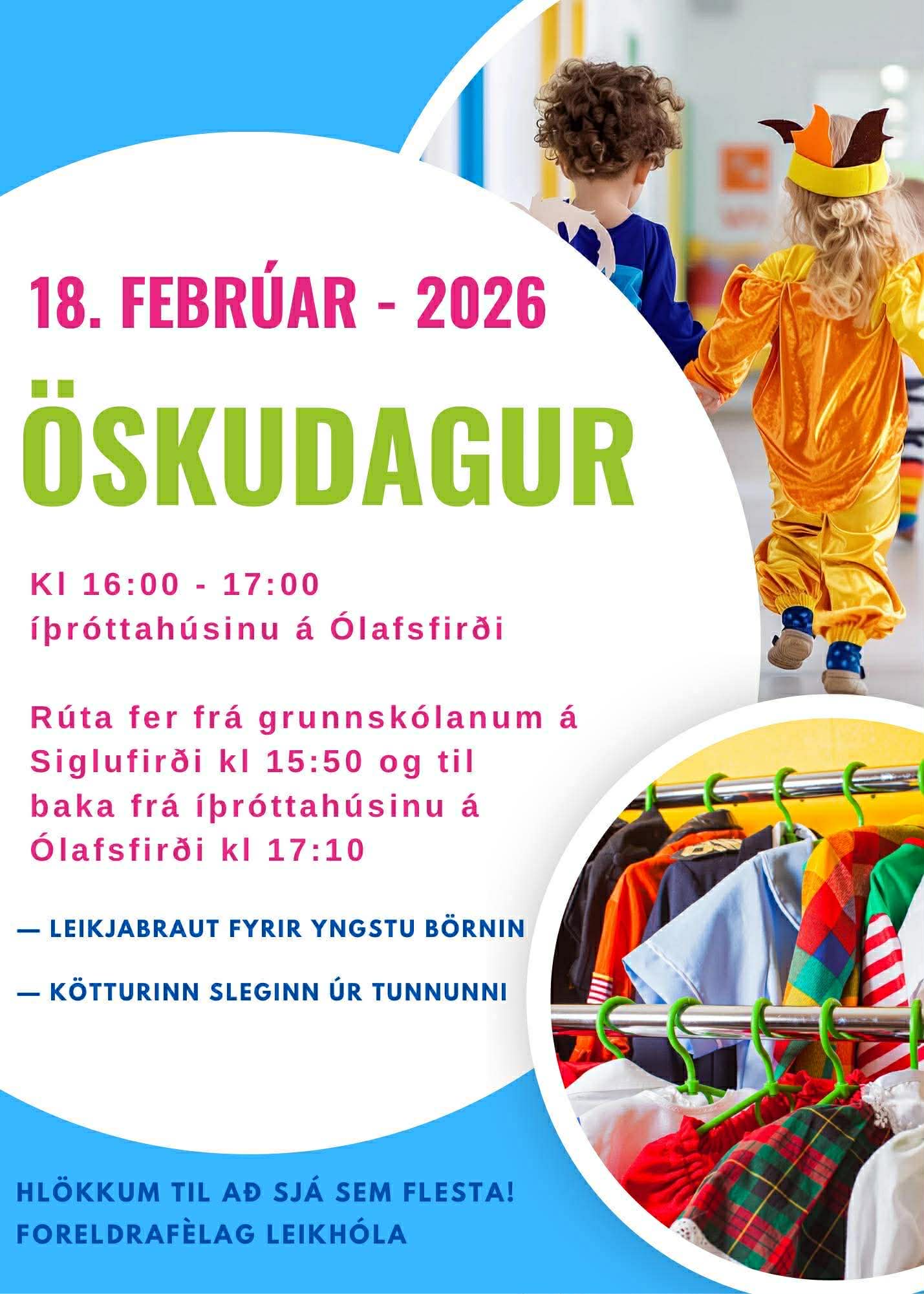 Foreldrafélag Leikhóla býður upp á Öskudagsskemmtun í íþróttahúsinu á Ólafsfirði milli klukkan 16 og 17, miðvikudaginn 18. febrúar.
