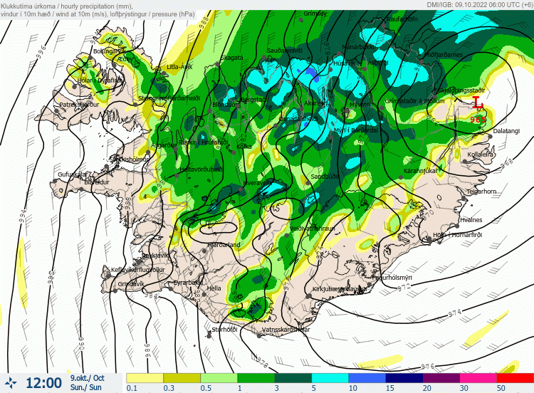 Áfram spáð mikilli úrkomu í dag. Spáð er að uppsöfnuð úrkoma yfir daginn og til morguns er spáð á bilinu 50-100 mm á Norðausturlandi.