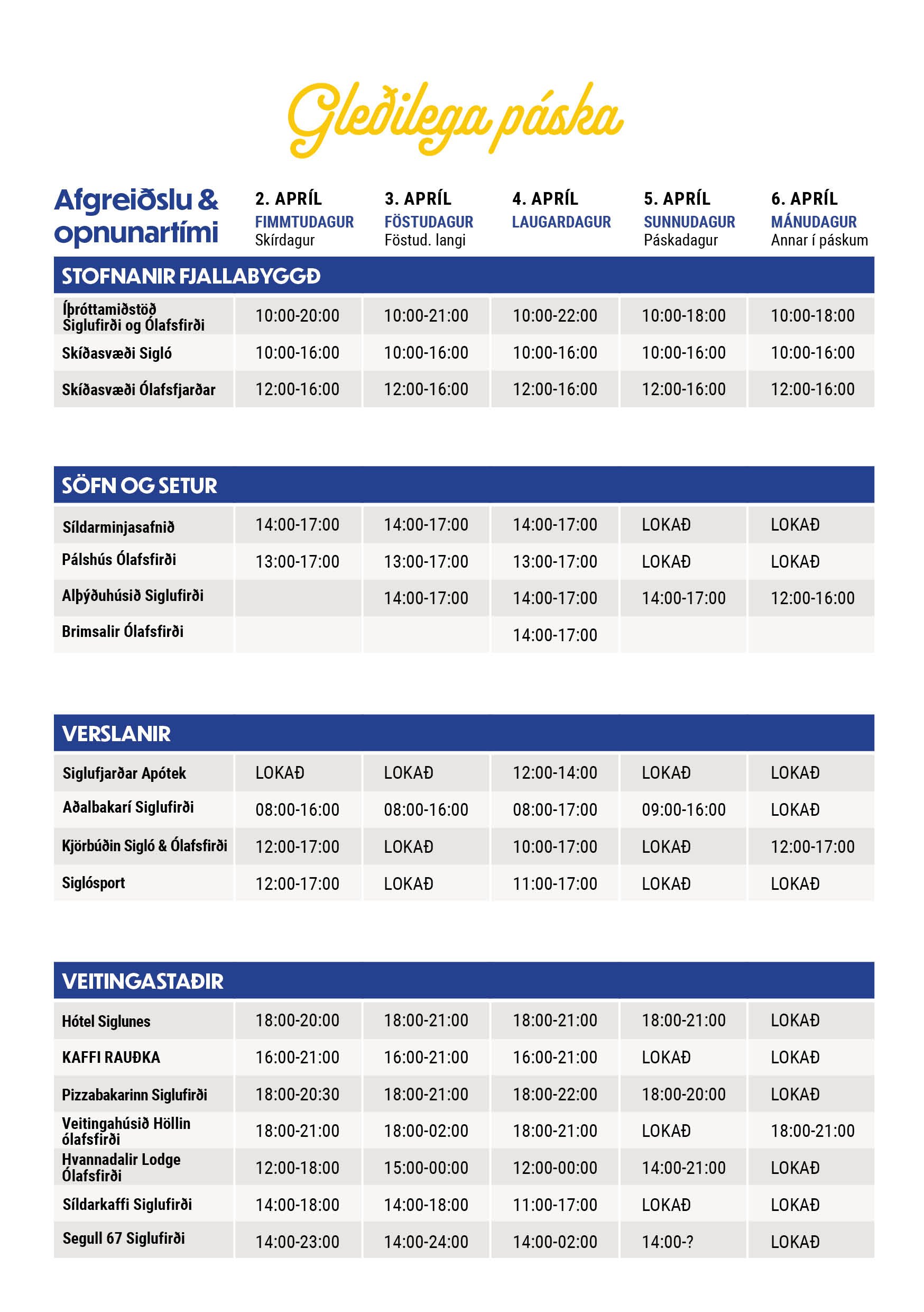 Við óskum öllum gleðilegra páska og hlökkum til að sjá ykkur njóta þess sem Fjallabyggð hefur upp á að bjóða.