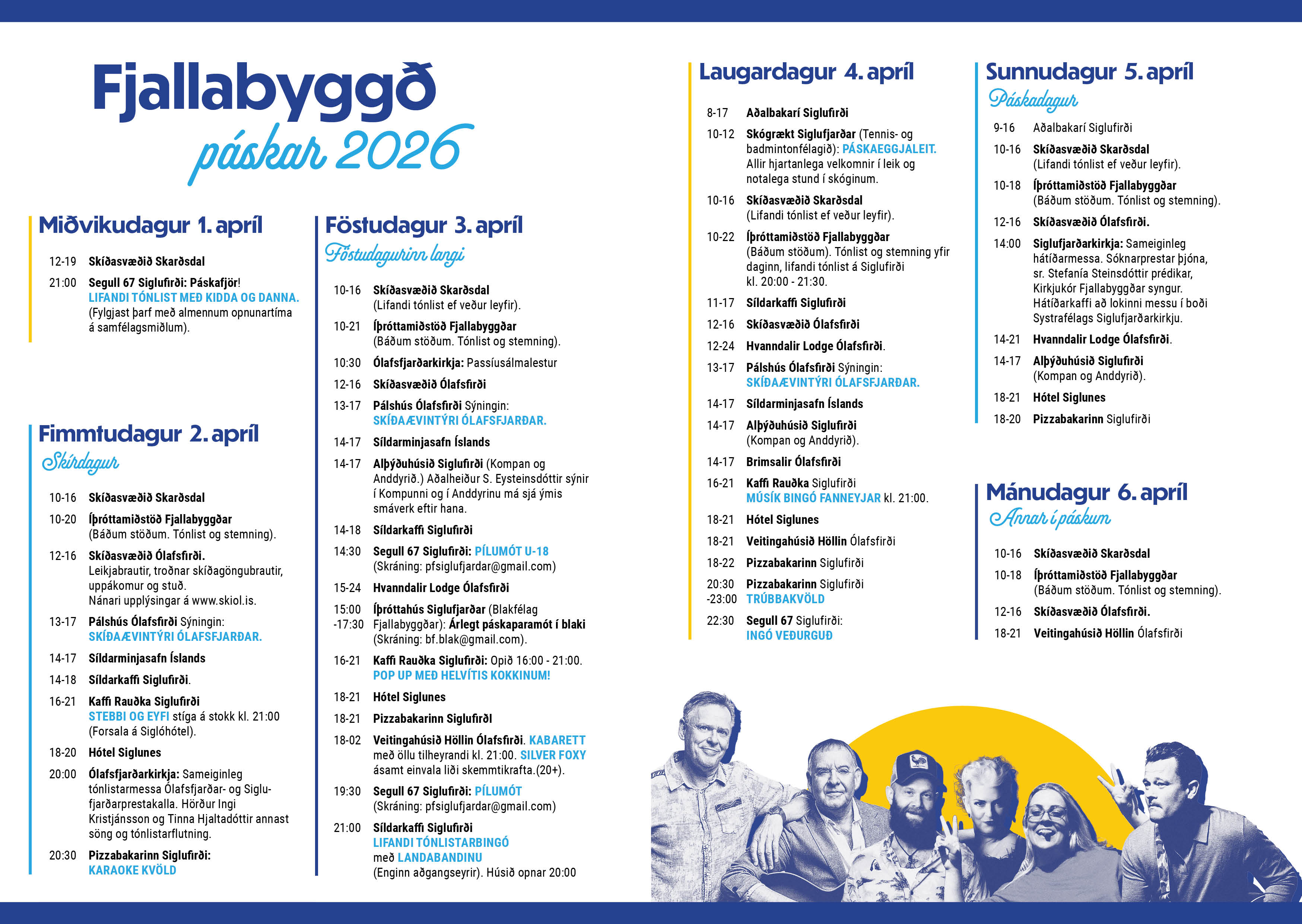 Páskarnir nálgast og nóg verður um að vera í Fjallabyggð. Íbúar og gestir geta hlakkað til fjölbreyttrar dagskrár þar sem allir ættu að finna eitthvað við sitt hæfi hvort sem það er útivist, menning, samvera eða skemmtilegir viðburðir.