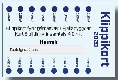 Hvert heimili fær 16 skipta kort til að nota yfir almanaksárið. Skráðir eigendur fasteigna sem fá greiðsluseðla fyrir sorpgjald (fasteignagjöld) geta sótt kortin inn á https://fjallakort.is/ . Valið er “Klippikort fyrir gámasvæði Fjallabyggðar”, svo rétt tegund korts sem við á og smellt á rafræna innskráningu. Ef innskráður notandi á rétt á kortinu án endurgjalds breytist verðið á kortinu í 0 kr. Athugið að setja þarf kortið í rafrænt veski í símanum svo það virki.