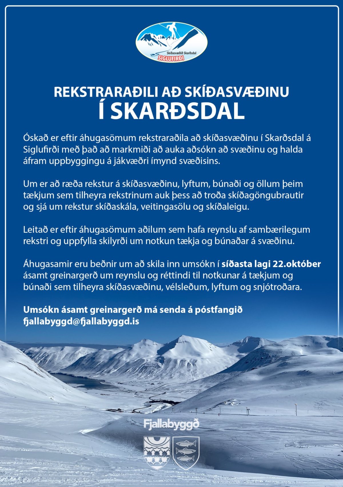Óskað er eftir áhugasömum rekstraraðila að skíðasvæðinu í Skarðsdal á Siglufirði með það að markmiði að auka aðsókn að svæðinu og halda áfram uppbyggingu á jákvæðri ímynd svæðisins.