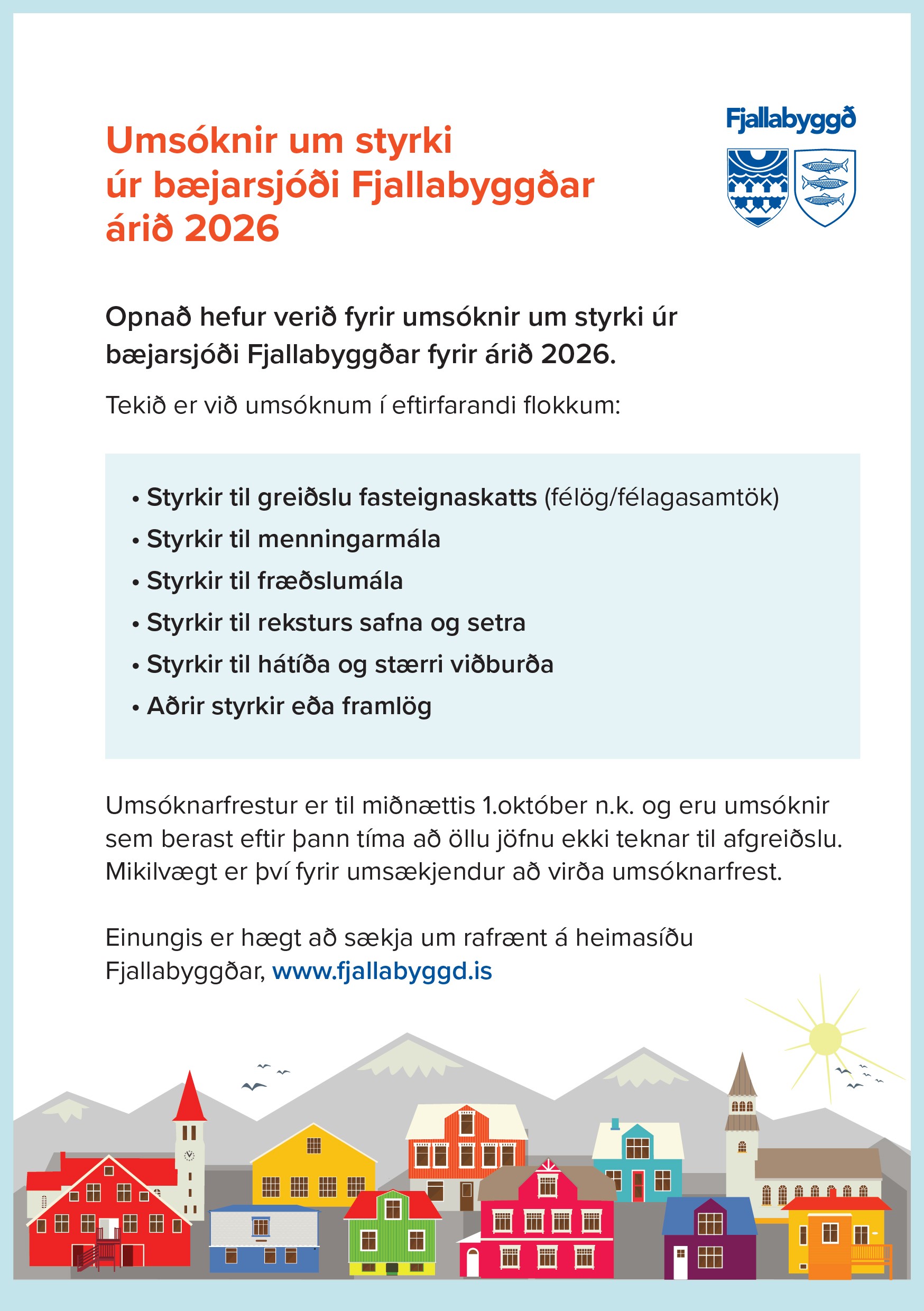 Opnað hefur verið fyrir umsóknir um styrki úr bæjarsjóði Fjallabyggðar fyrir árið 2026. Tekið er við umsóknum í eftirfarandi flokkum: