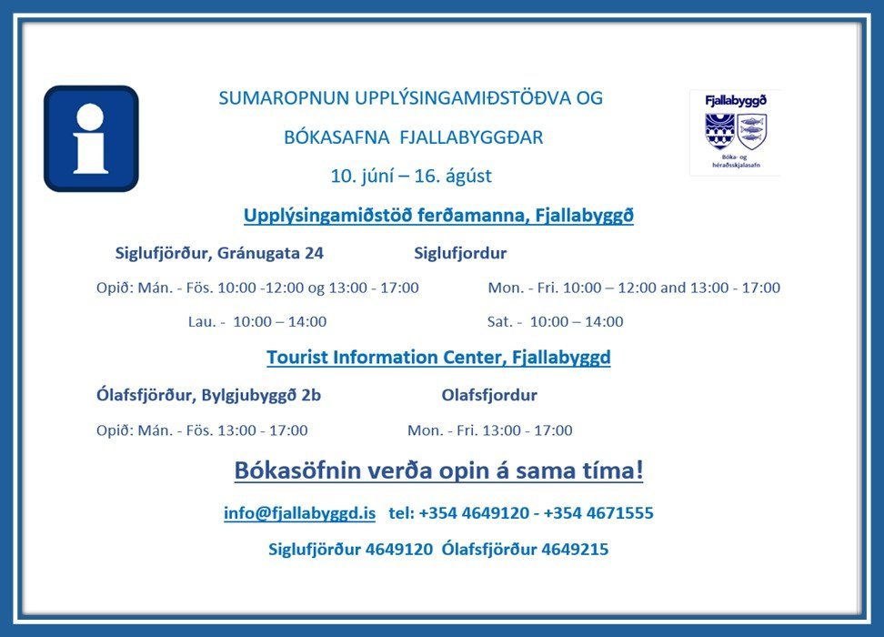 Opnunartími Siglufirði: Opið milli kl. 13:00 - 17:00 alla virka daga. Lokað um helgar.